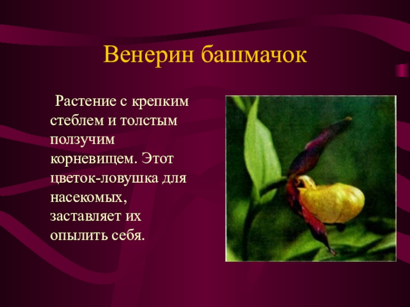 Растение с крепким стеблем и толстым ползучим корневищем. Этот цветок-ловушка