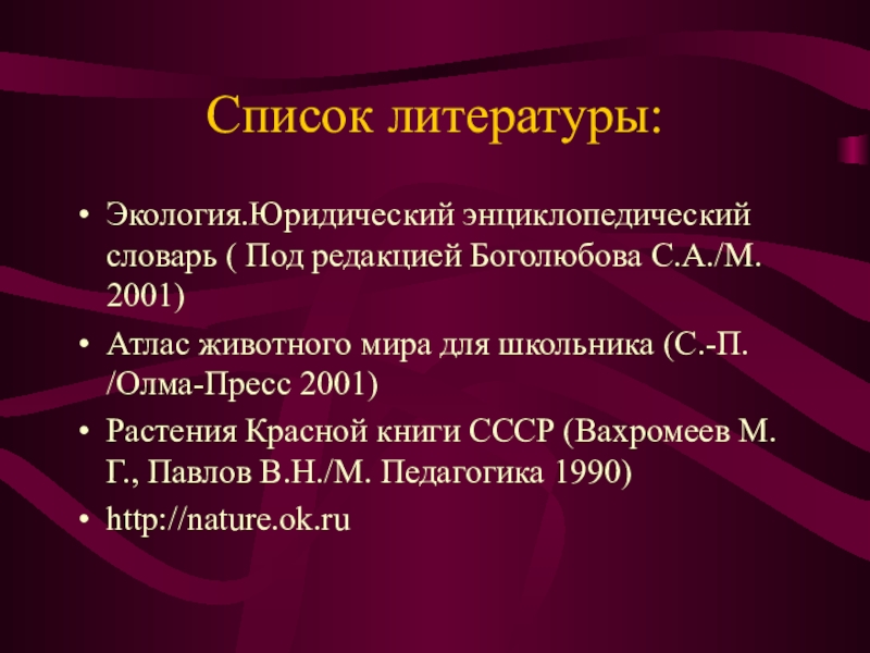 Экология.Юридический энциклопедический словарь ( Под редакцией Боголюбова С.А./М. 2001)