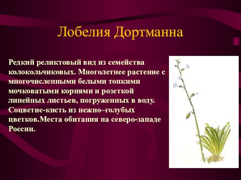 белыми тонкими мочковатыми корнями и розеткой линейных листьев, погруженных в воду. Соцветие-кисть из нежно–голубых цветков.Места обитания на северо-западе России.