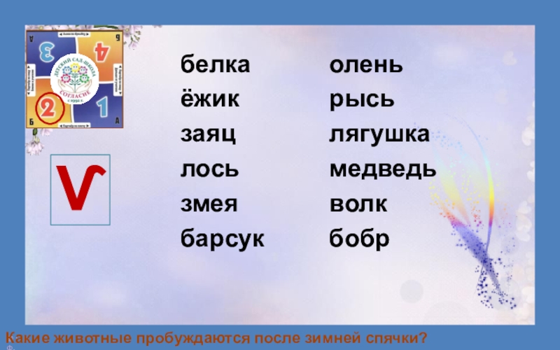 белкаёжикзаяцлосьзмеябарсукКакие животные пробуждаются после зимней спячки?оленьрысьлягушкамедведьволкбобрѴ