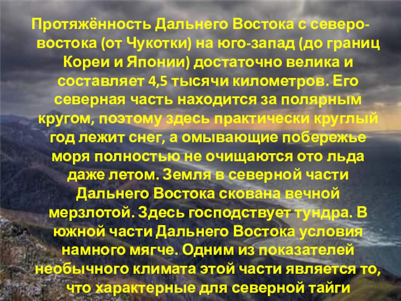 Кореи и Японии) достаточно велика и составляет 4,5 тысячи километров. Его северная часть находится за полярным кругом, поэтому здесь практически круглый год лежит снег, а омывающие побережье моря полностью не очищаются ото льда даже летом. Земля в северной части Дальнего Востока скована вечной мерзлотой. Здесь господствует тундра. В южной части Дальнего Востока условия намного мягче. Одним из показателей необычного климата этой части является то, что характерные для северной тайги деревья соседствуют с растениями, чаще встречающимися в субтропиках.