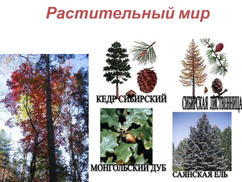 Растительный мирСАЯНСКАЯ ЕЛЬ МОНГОЛЬСКИЙ ДУБ СИБИРСКАЯ ЛИСТВЕННИЦА КЕДР СИБИРСКИЙ