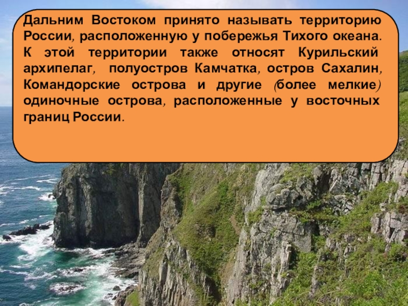 Дальним Востоком принято называть территорию России, расположенную у побережья Тихого океана.
