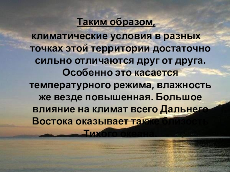отличаются друг от друга. Особенно это касается температурного режима, влажность же везде повышенная. Большое влияние на климат всего Дальнего Востока оказывает также близость Тихого океана.