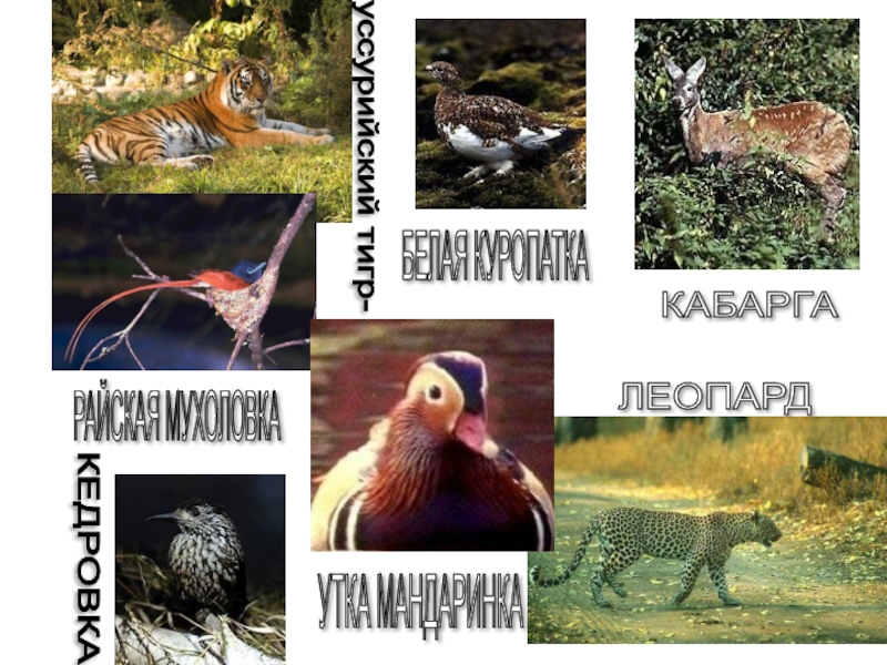 КАБАРГА УТКА МАНДАРИНКА КЕДРОВКА ЛЕОПАРД БЕЛАЯ КУРОПАТКА РАЙСКАЯ МУХОЛОВКА уссурийский тигр-
