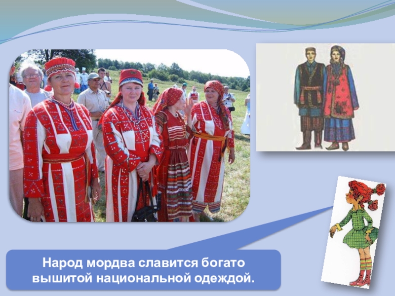Слайд 24Народ мордва славится богато вышитой национальной одеждой.