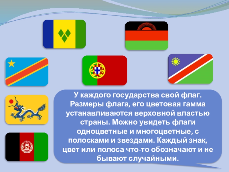 Слайд 13У каждого государства свой флаг. Размеры флага, его цветовая гамма устанавливаются