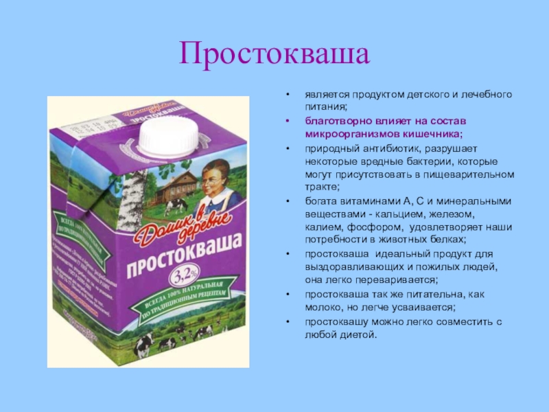 простокваша идеальный продукт для выздоравливающих и пожилых людей, она легко переваривается;