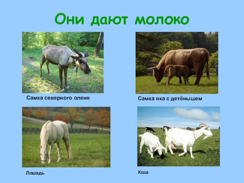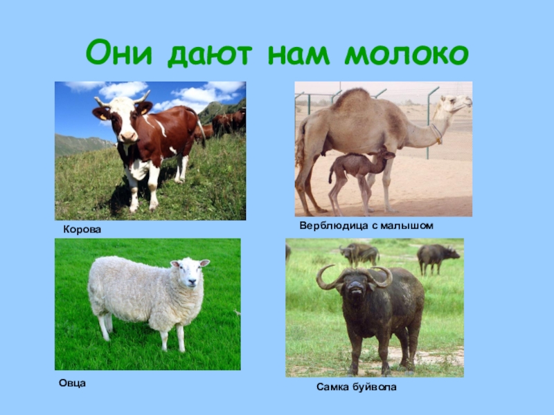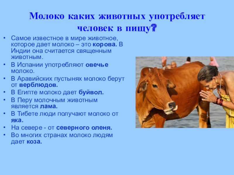 Слайд 22Молоко каких животных употребляет человек в пищу?