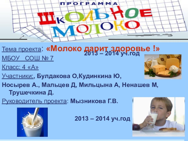 Слайд 1Тема проекта: «Молоко дарит здоровье !»