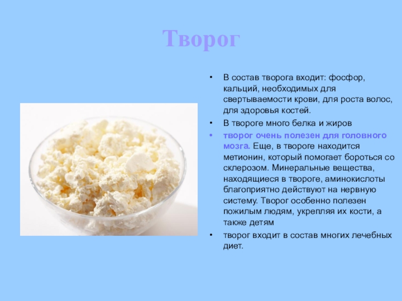 В состав творога входит: фосфор, кальций, необходимых для свертываемости крови, для