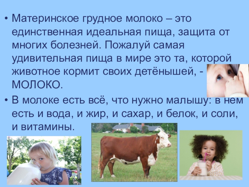 В молоке есть всё, что нужно малышу: в нём есть и вода, и жир, и сахар, и белок, и соли, и витамины.