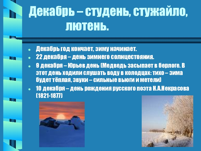 9 декабря – Юрьев день (Медведь засыпает в берлоге. В этот день ходили слушать воду в колодцах: тихо – зима будет тёплая, звуки – сильные вьюги и метели)