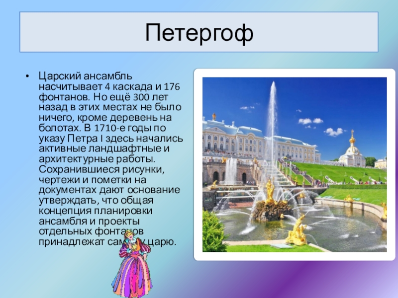 лет назад в этих местах не было ничего, кроме деревень на болотах. В 1710-е годы по указу Петра I здесь начались активные ландшафтные и архитектурные работы. Сохранившиеся рисунки, чертежи и пометки на документах дают основание утверждать, что общая концепция планировки ансамбля и проекты отдельных фонтанов принадлежат самому царю.
