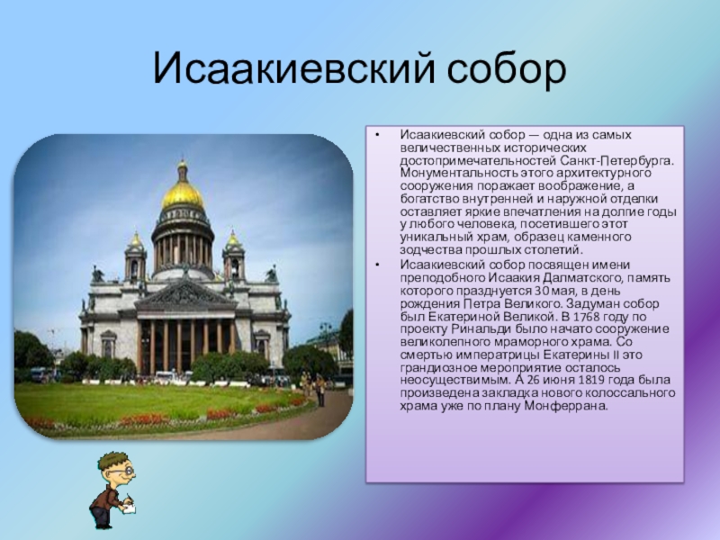Исаакиевский собор посвящен имени преподобного Исаакия Далматского, память которого празднуется 30 мая, в день рождения Петра Великого. Задуман собор был Екатериной Великой. В 1768 году по проекту Ринальди было начато сооружение великолепного мраморного храма. Со смертью императрицы Екатерины II это грандиозное мероприятие осталось неосуществимым. А 26 июня 1819 года была произведена закладка нового колоссального храма уже по плану Монферрана.