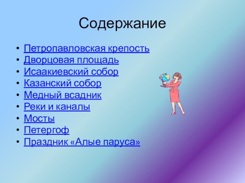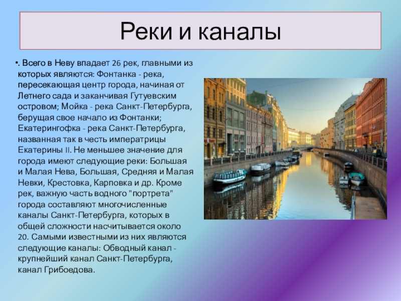 которых являются: Фонтанка - река, пересекающая центр города, начиная от Летнего сада и заканчивая Гутуевским островом; Мойка - река Санкт-Петербурга, берущая свое начало из Фонтанки; Екатерингофка - река Санкт-Петербурга, названная так в честь императрицы Екатерины II. Не меньшее значение для города имеют следующие реки: Большая и Малая Нева, Большая, Средняя и Малая Невки, Крестовка, Карповка и др. Кроме рек, важную часть водного "портрета" города составляют многочисленные каналы Санкт-Петербурга, которых в общей сложности насчитывается около 20. Самыми известными из них являются следующие каналы: Обводный канал - крупнейший канал Санкт-Петербурга, канал Грибоедова.