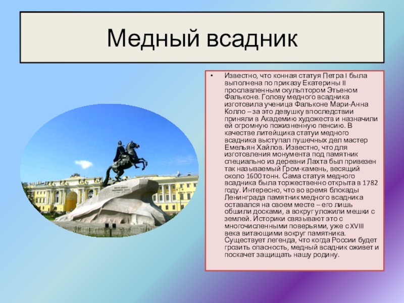 Екатерины II прославленным скульптором Этьеном Фальконе. Голову медного всадника изготовила ученица Фальконе Мари-Анна Колло – за это девушку впоследствии приняли в Академию художеств и назначили ей огромную пожизненную пенсию. В качестве литейщика статуи медного всадника выступал пушечных дел мастер Емельян Хайлов. Известно, что для изготовления монумента под памятник специально из деревни Лахта был привезен так называемый Гром-камень, весящий около 1600 тонн. Сама статуя медного всадника была торжественно открыта в 1782 году. Интересно, что во время блокады Ленинграда памятник медного всадника оставался на своем месте – его лишь обшили досками, а вокруг уложили мешки с землей. Историки связывают это с многочисленными поверьями, уже с XVIII века витающими вокруг памятника. Существует легенда, что когда России будет грозить опасность, медный всадник оживет и поскачет защищать нашу родину.