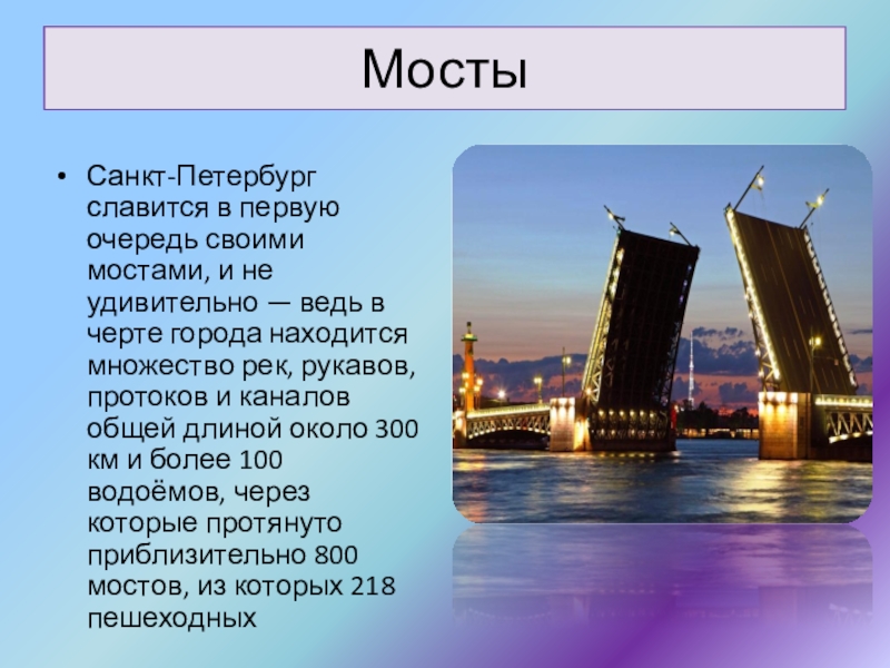 ведь в черте города находится множество рек, рукавов, протоков и каналов общей длиной около 300 км и более 100 водоёмов, через которые протянуто приблизительно 800 мостов, из которых 218 пешеходных