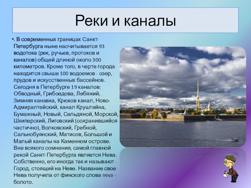 (рек, ручьев, протоков и каналов) общей длиной около 300 километров. Кроме того, в черте города находится свыше 100 водоемов - озер, прудов и искусственных бассейнов. Сегодня в Петербурге 19 каналов: Обводный, Грибоедова, Лебяжий, Зимняя канавка, Крюков канал, Ново-Адмиралтейский, канал Круштейна, Бумажный, Новый, Сельдяной, Морской, Шкиперский, Лиговский (сохранившийся частично), Волковский, Гребной, Сальнобуянский, Матисов, Большой и Малый каналы на Каменном острове. Вне всякого сомнения, самой главной рекой Санкт-Петербурга является Нева. Собственно, его иногда так и называют - Город, стоящий на Неве. Название свое Нева получила от финского слова neva - болото.