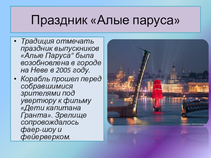 Традиция отмечать праздник выпускников «Алые Паруса" была возобновлена в