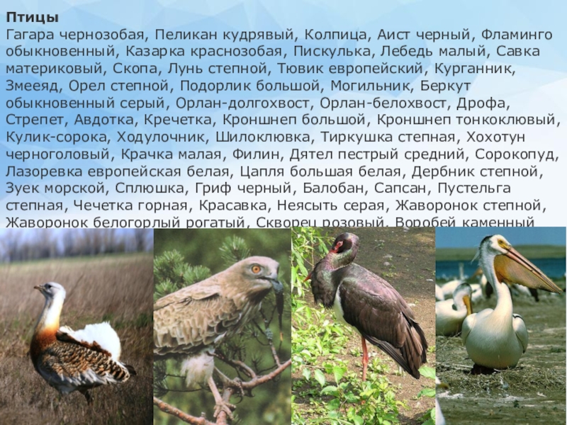 Пискулька, Лебедь малый, Савка материковый, Скопа, Лунь степной, Тювик европейский, Курганник, Змееяд, Орел степной, Подорлик большой, Могильник, Беркут обыкновенный серый, Орлан-долгохвост, Орлан-белохвост, Дрофа, Стрепет, Авдотка, Кречетка, Кроншнеп большой, Кроншнеп тонкоклювый, Кулик-сорока, Ходулочник, Шилоклювка, Тиркушка степная, Хохотун черноголовый, Крачка малая, Филин, Дятел пестрый средний, Сорокопуд, Лазоревка европейская белая, Цапля большая белая, Дербник степной, Зуек морской, Сплюшка, Гриф черный, Балобан, Сапсан, Пустельга степная, Чечетка горная, Красавка, Неясыть серая, Жаворонок степной, Жаворонок белогорлый рогатый, Скворец розовый, Воробей каменный