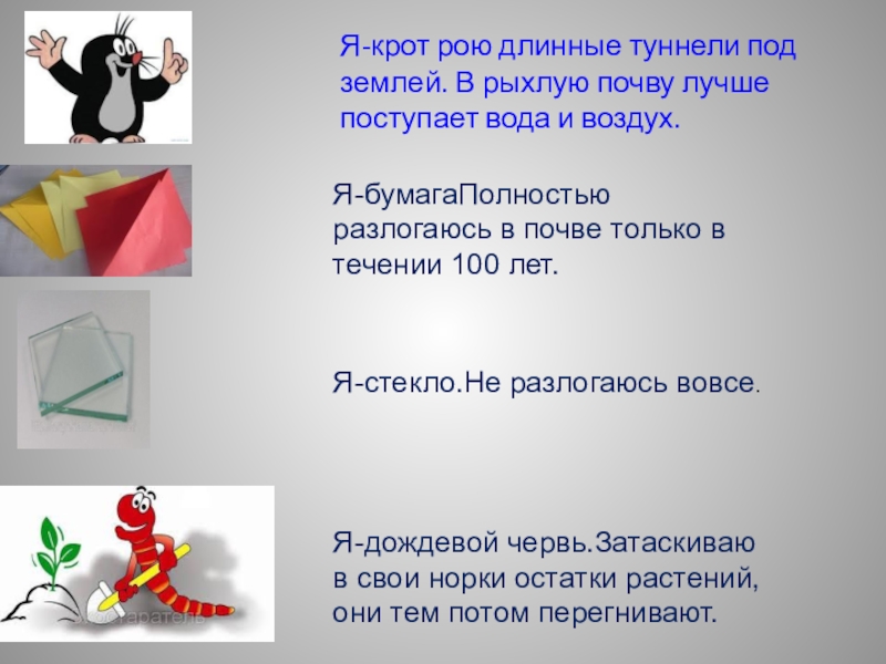 Я-дождевой червь.Затаскиваю в свои норки остатки растений, они тем потом перегнивают.