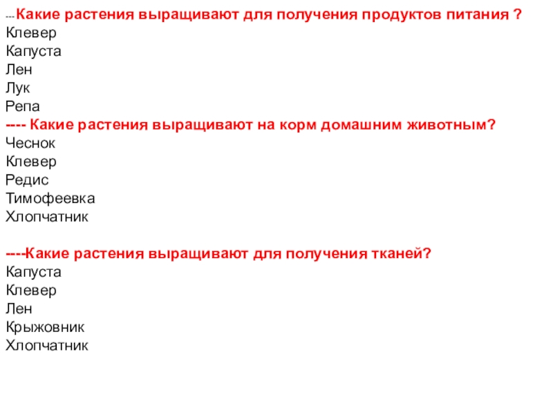 --- Какие растения выращивают для получения продуктов питания ?КлеверКапустаЛенЛукРепа---- Какие растения выращивают на корм домашним животным?ЧеснокКлеверРедисТимофеевкаХлопчатник ----Какие растения