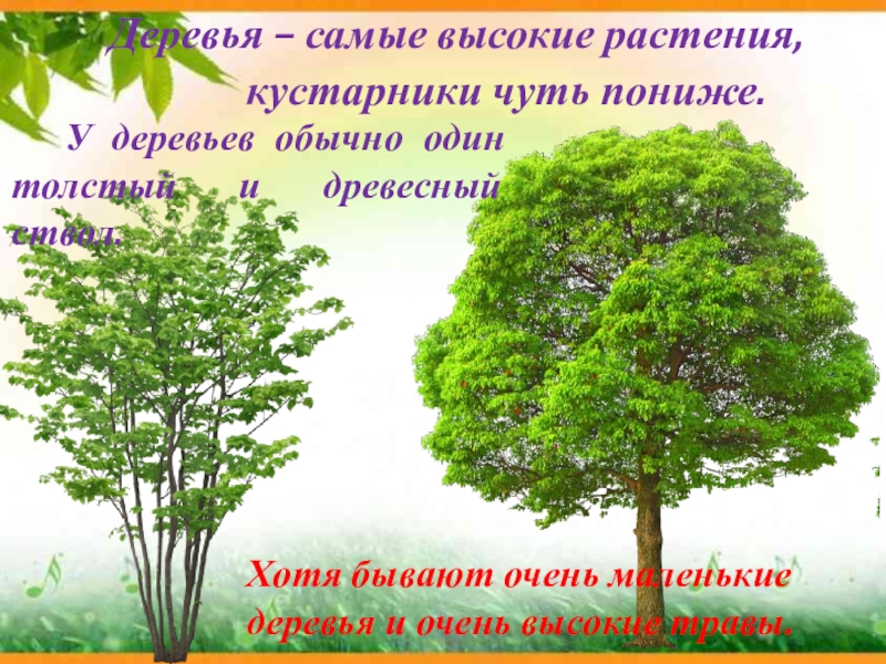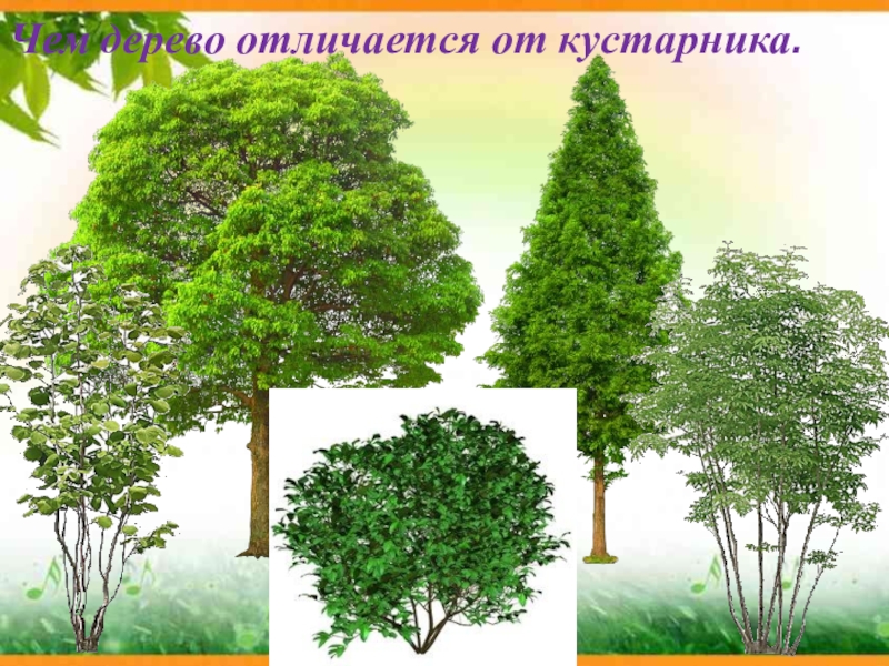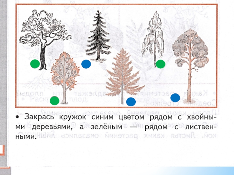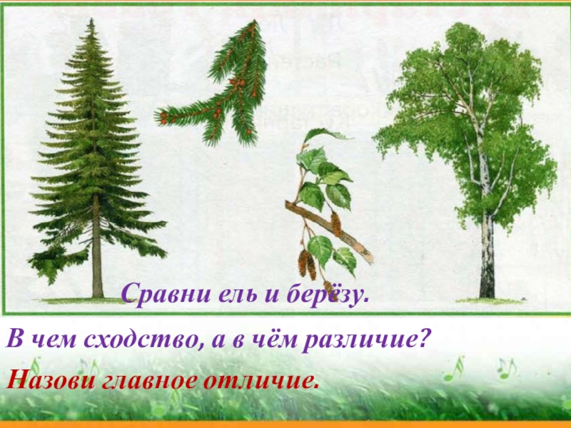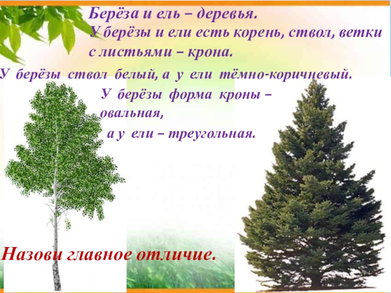 У берёзы ствол белый, а у ели тёмно-коричневый.