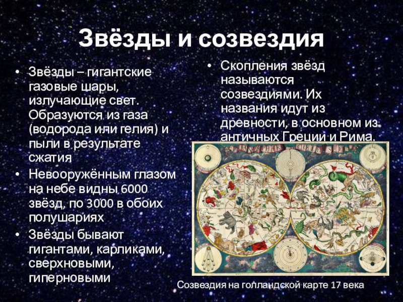 Звёзды – гигантские газовые шары, излучающие свет. Образуются из газа (водорода или гелия) и пыли в результате сжатия