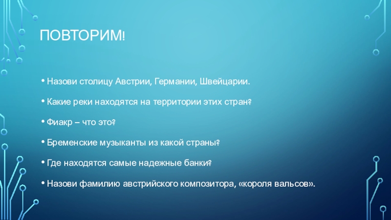 Повторим! Назови столицу Австрии, Германии, Швейцарии.Какие реки находятся на территории этих стран?Фиакр – что это?Бременские музыканты из