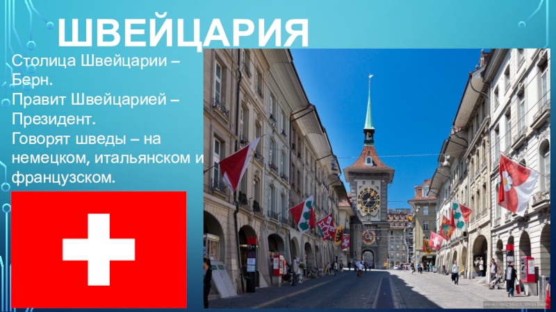 ШвейцарияСтолица Швейцарии – Берн.Правит Швейцарией – Президент.Говорят шведы – на немецком, итальянском и французском.