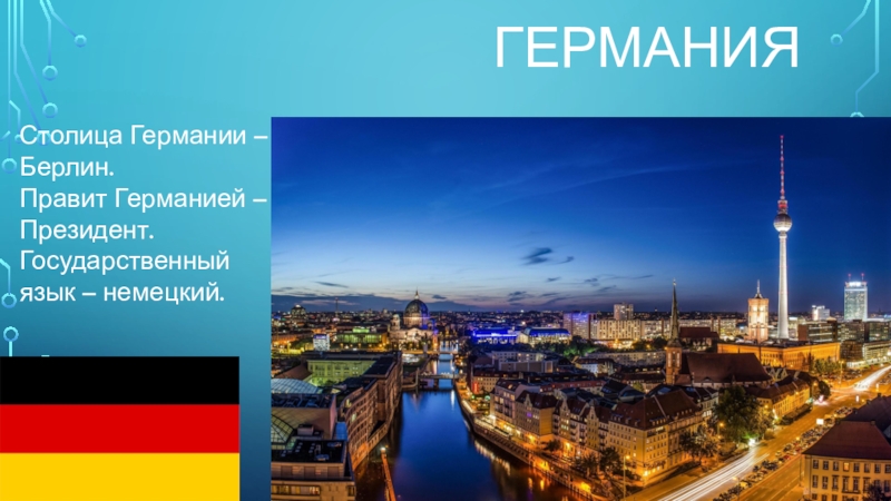ГерманияСтолица Германии – Берлин.Правит Германией – Президент.Государственный язык – немецкий.