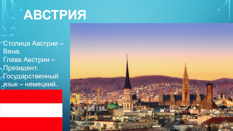 АвстрияСтолица Австрии – Вена.Глава Австрии – Президент.Государственный язык – немецкий.