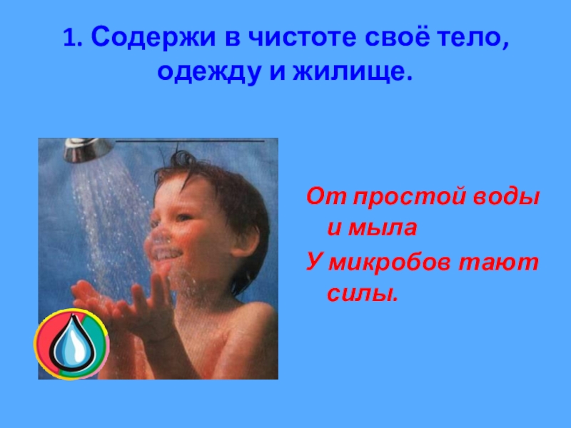 1. Содержи в чистоте своё тело, одежду и жилище.От простой воды и мылаУ микробов тают силы.