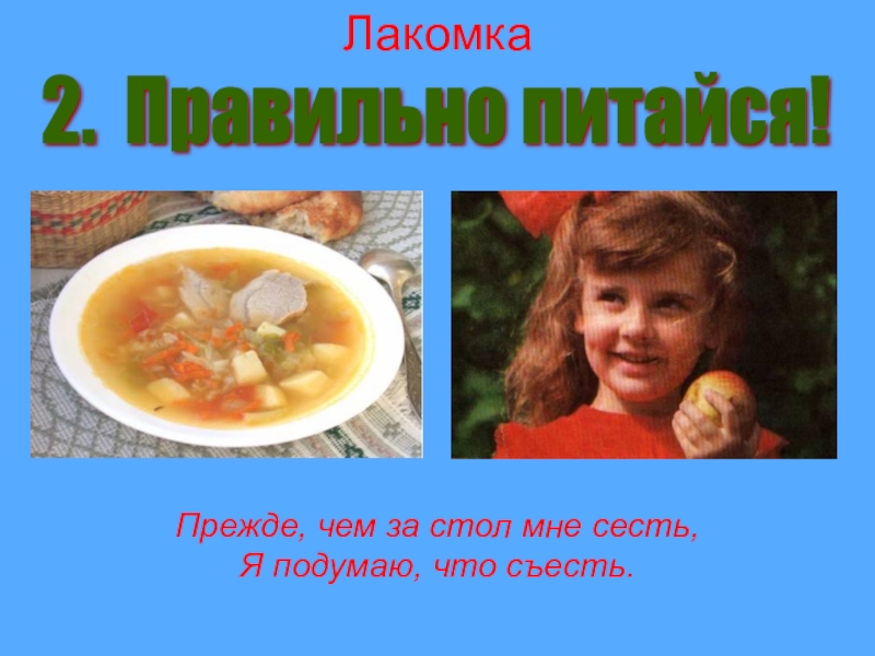 2. Правильно питайся! Прежде, чем за стол мне сесть,Я подумаю, что съесть.Лакомка