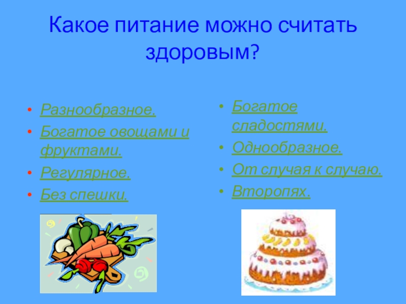 Какое питание можно считать здоровым?Разнообразное.Богатое овощами и фруктами.Регулярное.Без спешки.Богатое сладостями.Однообразное.От случая к случаю.Второпях.