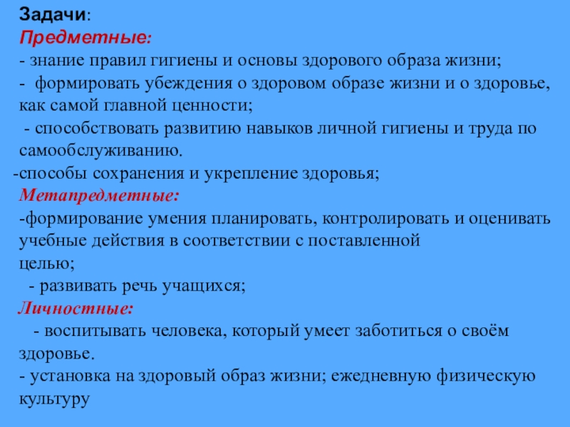 Задачи:Предметные:- знание правил гигиены и основы здорового образа жизни;- формировать убеждения о здоровом образе жизни и о