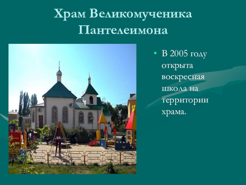 Храм Великомученика ПантелеимонаВ 2005 году открыта воскресная школа на территории храма.