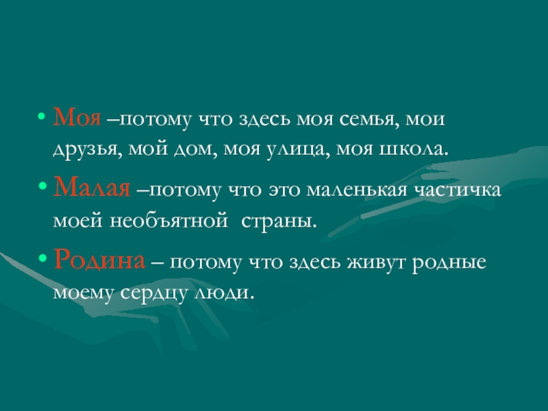 Моя –потому что здесь моя семья, мои друзья, мой дом, моя улица, моя школа.Малая –потому что это