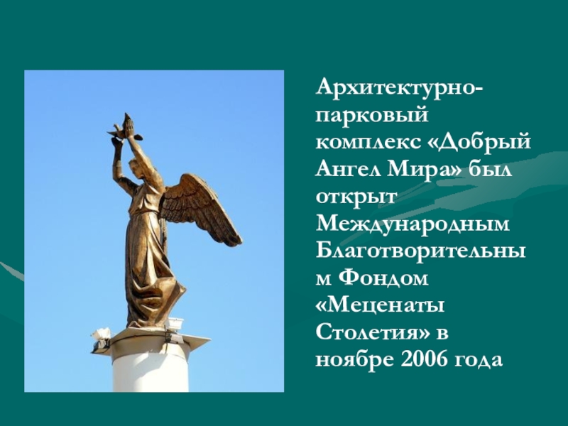 Архитектурно-парковый комплекс «Добрый Ангел Мира» был открыт Международным Благотворительным Фондом «Меценаты Столетия» в ноябре 2006
