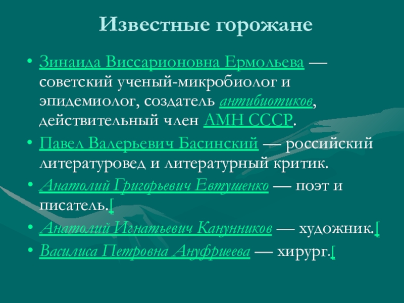 Известные горожане Зинаида Виссарионовна Ермольева — советский ученый-микробиолог и эпидемиолог, создатель антибиотиков, действительный член АМН СССР. Павел Валерьевич