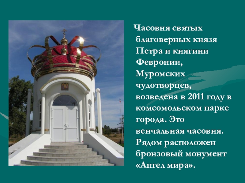 чудотворцев, возведена в 2011 году в комсомольском парке города. Это венчальная часовня. Рядом расположен бронзовый монумент «Ангел мира».