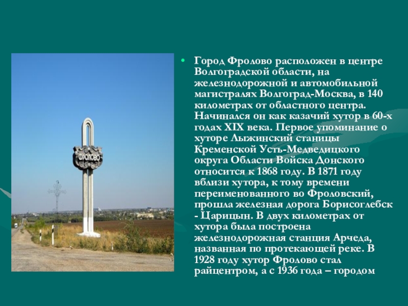 Город Фролово расположен в центре Волгоградской области, на железнодорожной и автомобильной магистралях Волгоград-Москва, в 140 километрах от