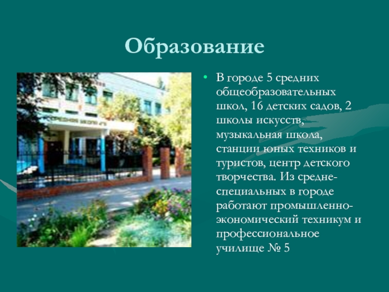 ОбразованиеВ городе 5 средних общеобразовательных школ, 16 детских садов, 2 школы искусств, музыкальная школа, станции юных техников