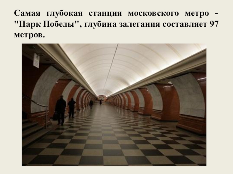 Слайд 14Самая глубокая станция московского метро - "Парк Победы", глубина залегания составляет