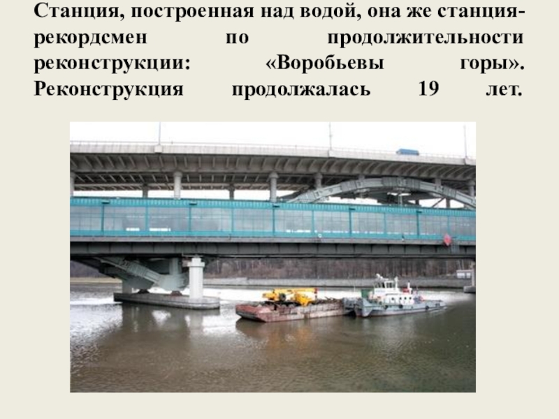 Слайд 15Станция, построенная над водой, она же станция-рекордсмен по продолжительности реконструкции: «Воробьевы