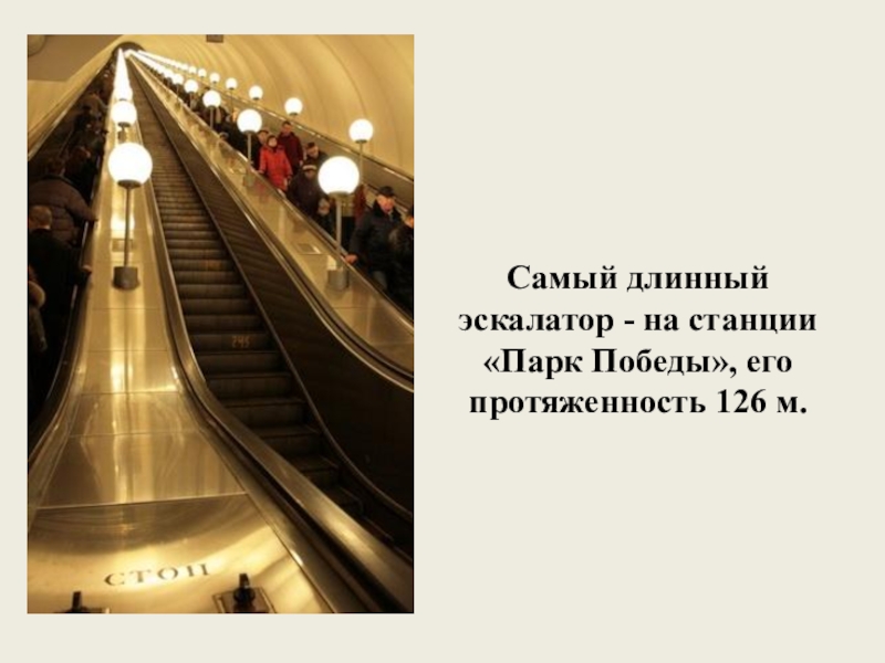 Слайд 13Самый длинный эскалатор - на станции «Парк Победы», его протяженность 126