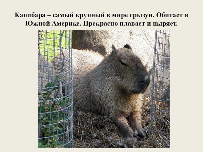 Слайд 20Капибара – самый крупный в мире грызун. Обитает в Южной Америке.