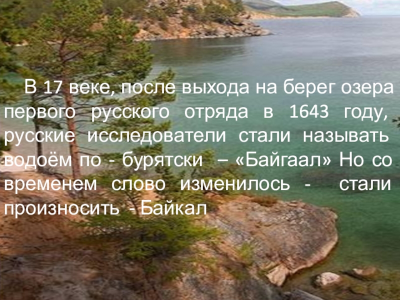 в 1643 году, русские исследователи стали называть водоём по - бурятски – «Байгаал» Но со временем слово изменилось - стали произносить - Байкал
