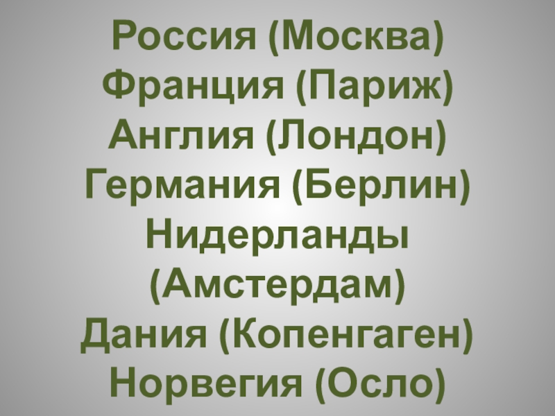 Слайд 2Россия (Москва) Франция (Париж) Англия (Лондон) Германия (Берлин) Нидерланды (Амстердам) Дания (Копенгаген) Норвегия (Осло)